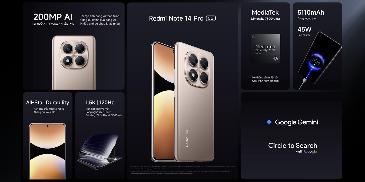 Bên cạnh đó, Redmi Note 14 Series còn tích hợp nhiều công cụ AI hữu ích như Circle to Search, AI Note, AI Recorder, AI Interpreter và AI Subtitles, giúp hỗ trợ tìm kiếm, ghi chú, dịch thuật, ghi âm và tóm tắt nội dung một cách nhanh chóng và chính xác. Đặc biệt, thiết bị sử dụng Google Gemini làm trợ lý ảo mặc định, hỗ trợ cá nhân hóa trải nghiệm và giúp việc tra cứu trở nên đơn giản hơn.