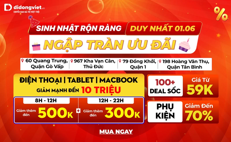 Đặc biệt, duy nhất trong ngày 1-6-2025, nhân dịp sinh nhật của 4 cửa hàng Di Động Việt ở TP.HCM (tại: 967 Kha Vận Cân, 79 Đồng Khởi, 198 Hoàng Văn Thụ và 60 Quang Trung), trong khung giờ vàng từ 8h đến 12h, khách hàng đến mua sắm sẽ được giảm thêm lên đến 500.000 đồng trên mức giá đã giảm. Ngoài ra, người dùng còn có cơ hội sở hữu điện thoại, tablet, MacBook với mức giá được giảm đến 10 triệu đồng, mua phụ kiện chính hãng với giá chỉ từ 59 nghìn đồng.
