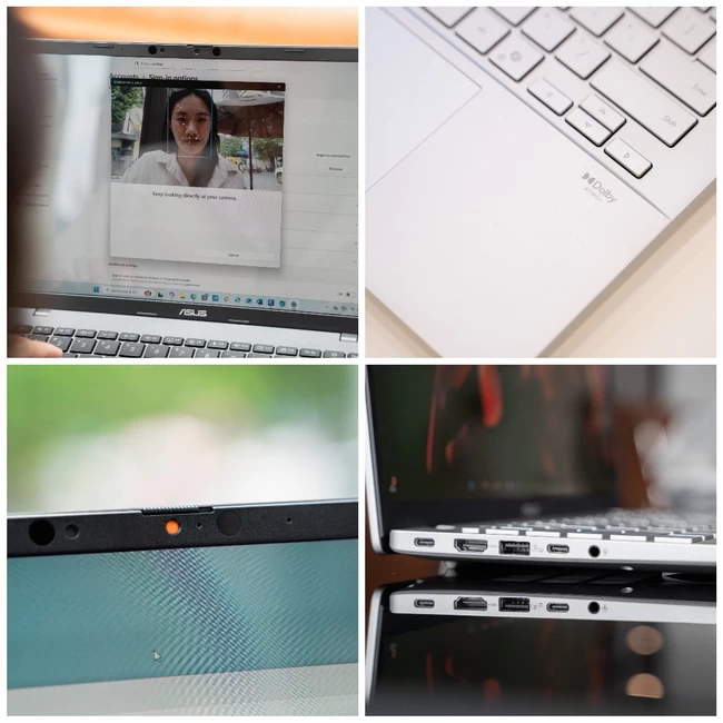 Một số trang bị trên cả hai phiên bản Vivobook S14/S16 chip Snapdragon X và AMD Ryzen AI: Webcam IR hỗ trợ nhận diện khuôn mặt, nắp che webcam vật lý, hệ thống loa hỗ trợ chuẩn Dolby Atmos và cổng kết nối đa dạng.