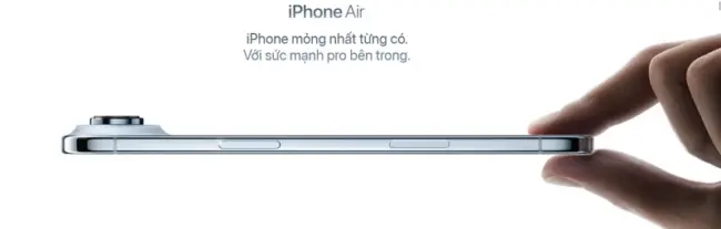 iPhone Air là chiếc iPhone mỏng nhất từ trước đến nay, chỉ 5,6mm (so với 8mm của iPhone 17) và nhẹ chỉ 165g với sức mạnh chuyên nghiệp bên trong. Màn hình 6.5 inch (so với 6.3 inch của iPhone 17). Bền bỉ hơn bất kỳ chiếc iPhone nào trước đây. Màn hình tốt nhất từ trước đến nay với lớp phủ Ceramic Shield 2 ở mặt trước. Màn hình LTPO Super Retina XDR OLED, 120Hz, HDR10, Dolby Vision, 1000 nits (typ), 1600 nits (HBM), 3000 nits (peak). Chip A19 Pro (3nm) mạnh mẽ như ở dòng 17 Pro/Pro Max với CPU 6 nhân và GPU 5 nhân đồ họa. Hệ thống single camera Fusion 48MP tiên tiến. Và camera trước Center Stage 18MP mới. Pin Li-Ion 3.149 mAh với sạc nhanh 20W (có thể sạc 50% pin trong 30 phút). Thời lượng pin lên tới 27 giờ video playback.