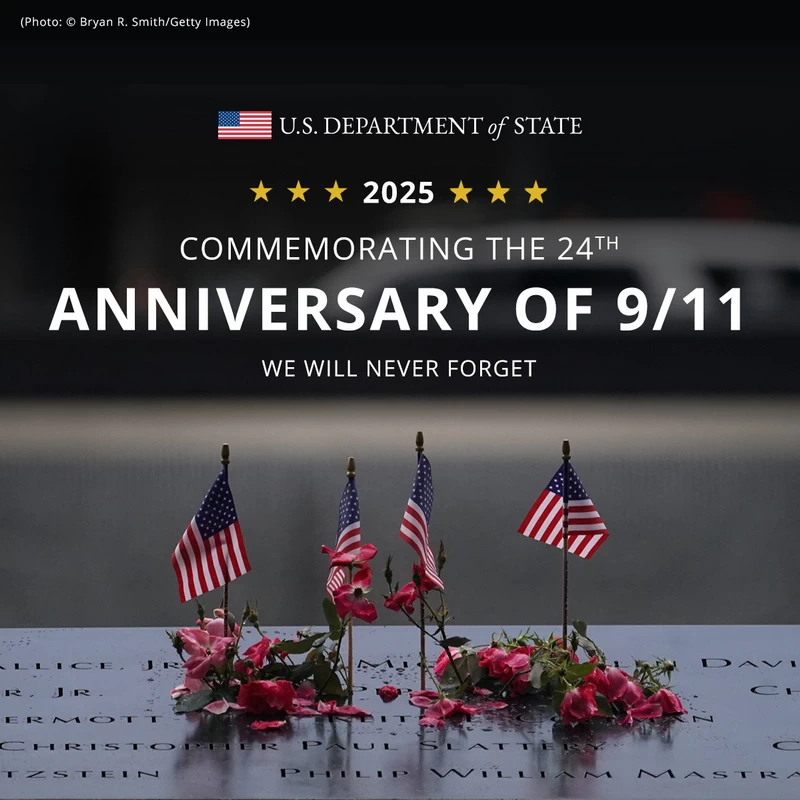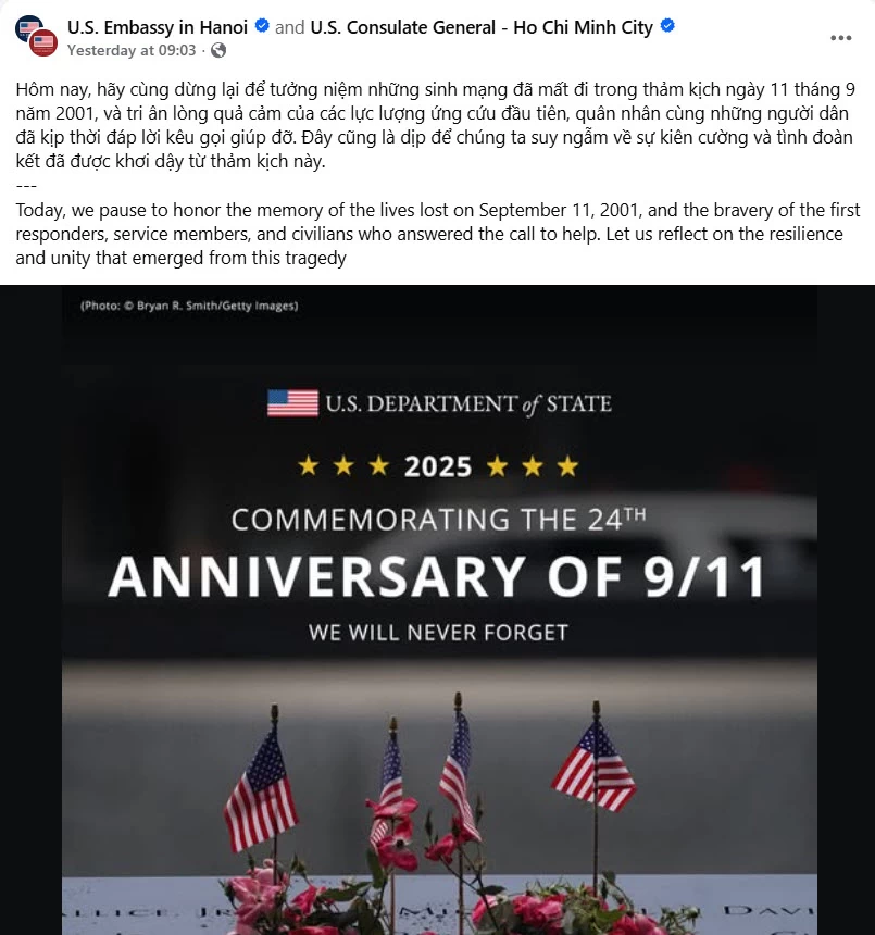 Tài khoản của Đại sứ quán Hoa Kỳ ở Hà Nội và Tổng Lãnh sự quán Hoa Kỳ tại TP.HCM ngày 11-9-2025 đăng status: “Hôm nay, hãy cùng dừng lại để tưởng niệm những sinh mạng đã mất đi trong thảm kịch ngày 11 tháng 9 năm 2001, và tri ân lòng quả cảm của các lực lượng ứng cứu đầu tiên, quân nhân cùng những người dân đã kịp thời đáp lời kêu gọi giúp đỡ. Đây cũng là dịp để chúng ta suy ngẫm về sự kiên cường và tình đoàn kết đã được khơi dậy từ thảm kịch này.”