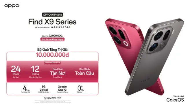 Trong chương trình mở bán từ nayđến hết ngày 7-11-2025, khi mua OPPO Find X9 Series, người dùng nhận được các ưu đãi đặc biệt với giá trị lên đến 10.000.000 đồng, bao gồm: