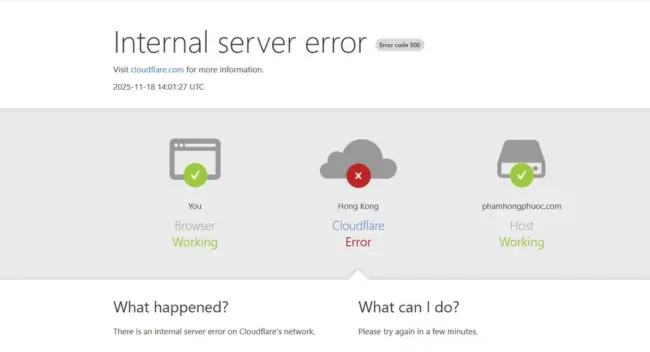 Tại TP.HCM, khi truy cập website có sử dụng dịch vụ Cloudflare (như dùng SSL, nameservers), admin nhận được báo lỗi Internal server error (lỗi máy chủ nội bộ) với mã Error code 500. Nó cho thấy máy chủ Clourflare tại Hong Kong bị sập.