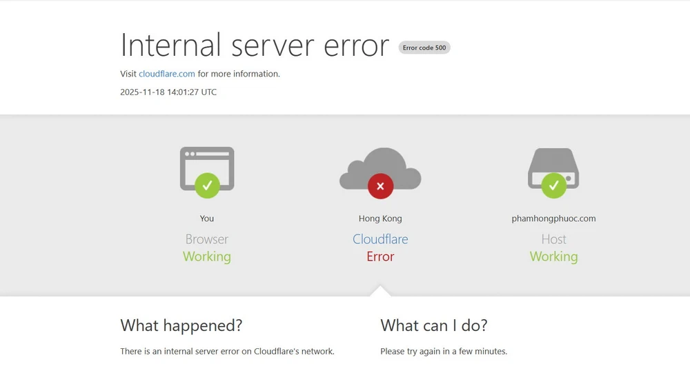 Tại TP.HCM, khi truy cập website có sử dụng dịch vụ Cloudflare (như dùng SSL, nameservers), admin nhận được báo lỗi Internal server error (lỗi máy chủ nội bộ) với mã Error code 500. Nó cho thấy máy chủ Clourflare tại Hong Kong bị sập.