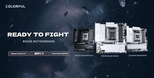 Công ty Công nghệ COLORFUL ngày 28-11-2025 đã công bố ba sản phẩm mới bổ sung cho dòng bo mạch chủ B850 gồm: CVN B850M ARK FROZEN, BATTLE-AX B850M-PLUS S WIFI7, và COLORFIRE B850M-MEOW WIFI7. Các mẫu bo mạch chủ mới này mang đến khả năng cung cấp điện năng được cải tiến, nâng cấp kết nối và thiết kế đặc trưng của COLORFUL, đáp ứng nhu cầu về hiệu năng của bộ vi xử lý AMD Ryzen thế hệ tiếp theo.