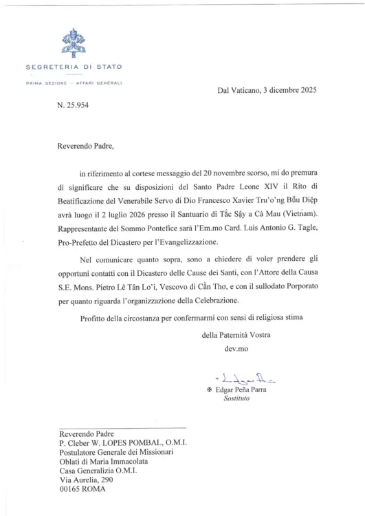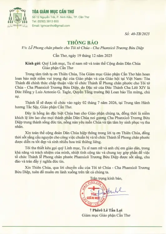 Tiếp đó, ngày 19-12-2025, Tòa Giám mục Cần Thơ, do Đức cha Phêrô Lê Tấn Lợi, Giám mục Giáo phận Cần Thơ ấn ký, đã có thông báo chính thức về Lễ Phong Chân phước cho Tôi tớ Chúa – Cha Phanxicô Xaviê Trương Bửu Diệp.