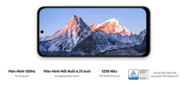 Màn hình LCD đục lỗ 6.75 inch có độ phân giải HD+ (720 x 1570 pixel), tần số quét 120Hz. Độ sáng HBM 1250 nit. Chứng nhận giảm ánh sáng xanh TUV Rheinland.