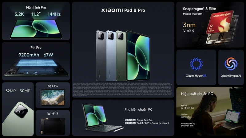 Dòng máy tính bảng Xiaomi Pad 8 Series, gồm Xiaomi Pad 8 Pro và Xiaomi Pad 8, đã được Xiaomi ra mắt chính thức tại Việt Nam tối 28-2-2026. Là thế hệ máy tính bảng cao cấp mới với thông điệp “Hiệu suất toàn năng”, Xiaomi Pad 8 Series hướng đến nhóm người dùng hiện đại, đang tìm kiếm một thiết bị mạnh mẽ cho công việc nhưng vẫn bảo đảm tính linh hoạt. Sở hữu hiệu năng vượt trội từ các vi xử lý Qualcomm Snapdragon 8 Elite hàng đầu, màn hình 3.2K 144Hz sắc nét, dung lượng pin lớn 9.200mAh cùng hệ sinh thái phụ kiện cao cấp, Xiaomi Pad 8 Series được phát triển để mang đến trải nghiệm hiệu năng chuẩn PC cho người dùng hiện đại, từ xử lý văn bản, họp trực tuyến cho đến sáng tạo nội dung.