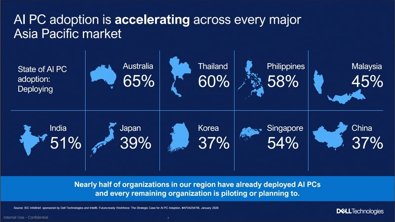 Sự chuyển dịch này đang được hiện thực hóa bằng những khoản đầu tư thiết thực. Trên toàn khu vực APAC, 65% doanh nghiệp được khảo sát cho biết họ sẵn sàng chi trả mức giá cao hơn từ 10% trở lên để trang bị AI PC; điều này minh chứng rõ nét cho vai trò hạ tầng cốt lõi của dòng thiết bị này trong các chiến lược AI cấp doanh nghiệp.